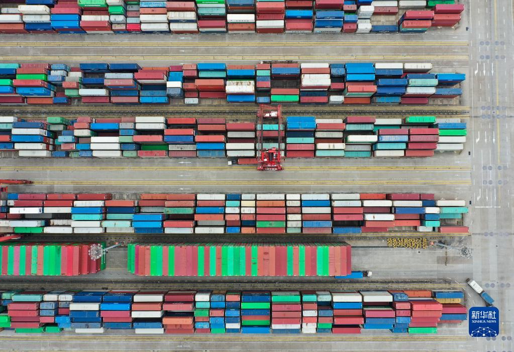 這是4月15日拍攝的上海洋山港集裝箱碼頭(無(wú)人機照片)。新華社記者 丁汀 攝