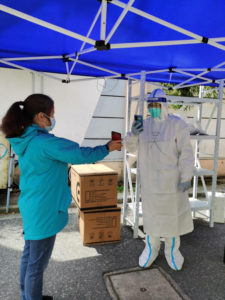 吳培凱在黃浦區的小區里為居民檢測核酸掃碼(受訪(fǎng)者供圖)