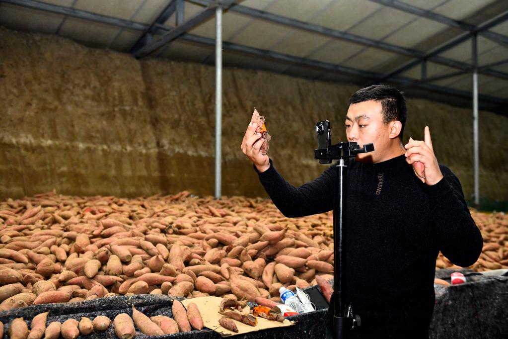 在山東一家紅薯農民專(zhuān)業(yè)合作社,主播在賣(mài)蜜薯。新華社記者郭緒雷 攝