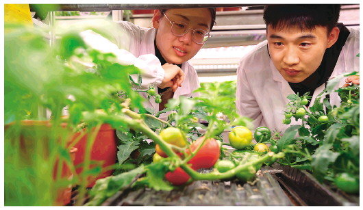 浙江大學(xué)博士研究生朱常安(右)與同學(xué)在玻璃溫室中觀(guān)察番茄生長(cháng)。受訪(fǎng)者供圖