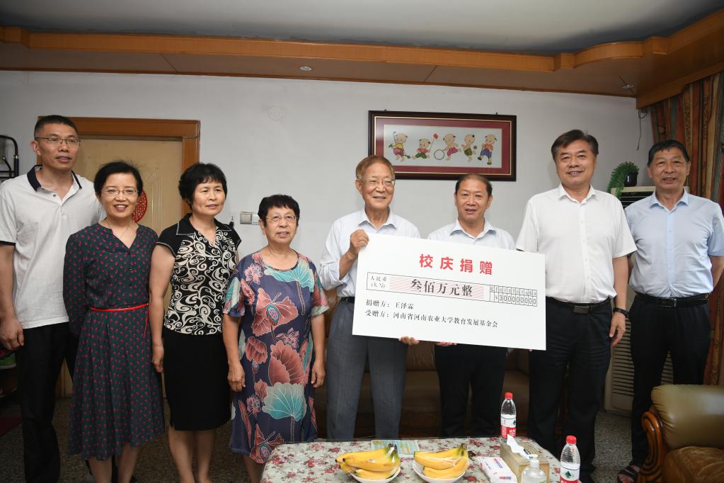 王澤霖(右四)向學(xué)校捐贈300萬(wàn)元。(河南農業(yè)大學(xué)供圖)