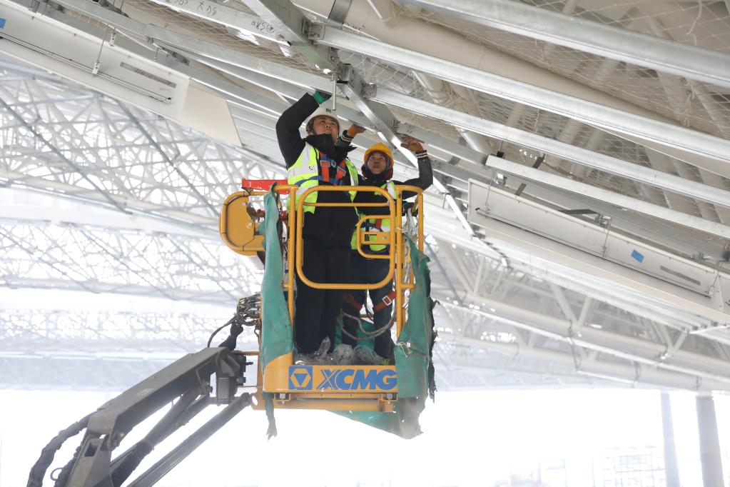 2月17日,在烏魯木齊機場(chǎng)改擴建工程項目工地,工人正在進(jìn)行新建航站樓內部施工。(受訪(fǎng)單位供圖)