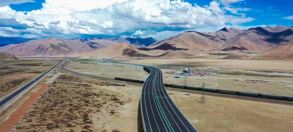 G6京藏高速公路那曲至拉薩段跨青藏鐵路特大橋。這條公路于2021年8月全線(xiàn)通車(chē)(無(wú)人機照片)。新華社記者 劉洪明 攝
