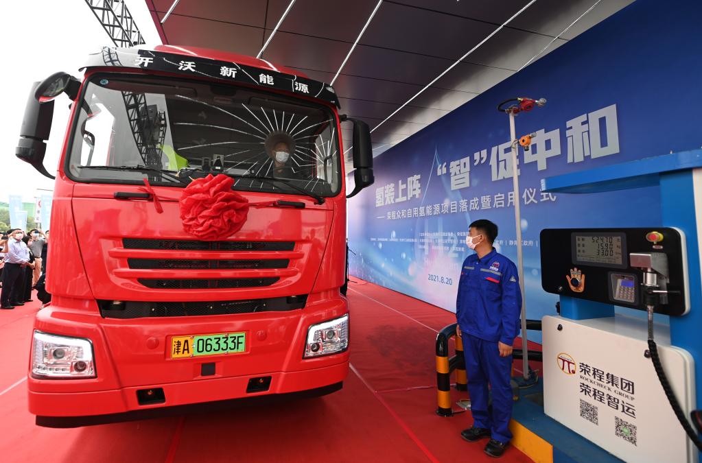 氫能重卡在榮程加氫站準備加注氫燃料。新華社記者 李然 攝