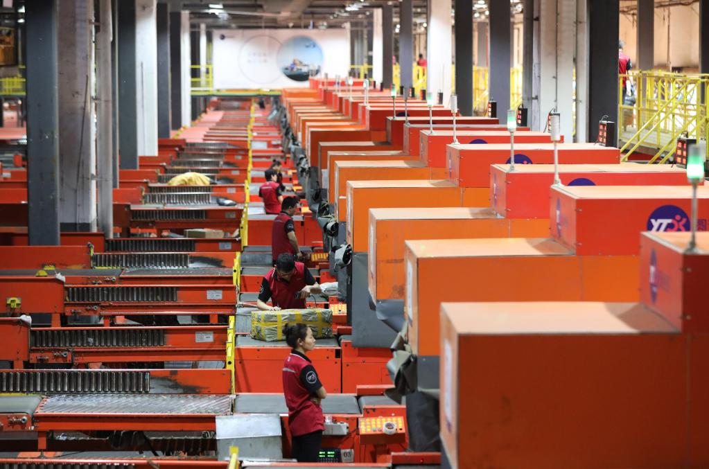 在永清縣圓通速遞北方總部基地內,工作人員進(jìn)行快遞卸車(chē)補碼作業(yè)。鄭晨子 攝