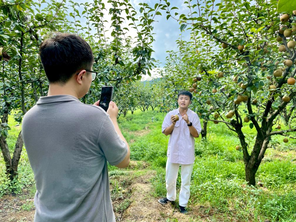 順著(zhù)她指的方向望去,有個(gè)年輕小伙兒正在直播:“我手上的翠冠梨,汁多飽滿(mǎn)‘嘎嘣脆’,今天在直播間10元兩斤包郵帶回家,喜歡的老鐵快下單!”平時(shí)果園只見(jiàn)果農采摘,如今還吸引大批網(wǎng)友在線(xiàn)圍觀(guān),熱鬧非凡。