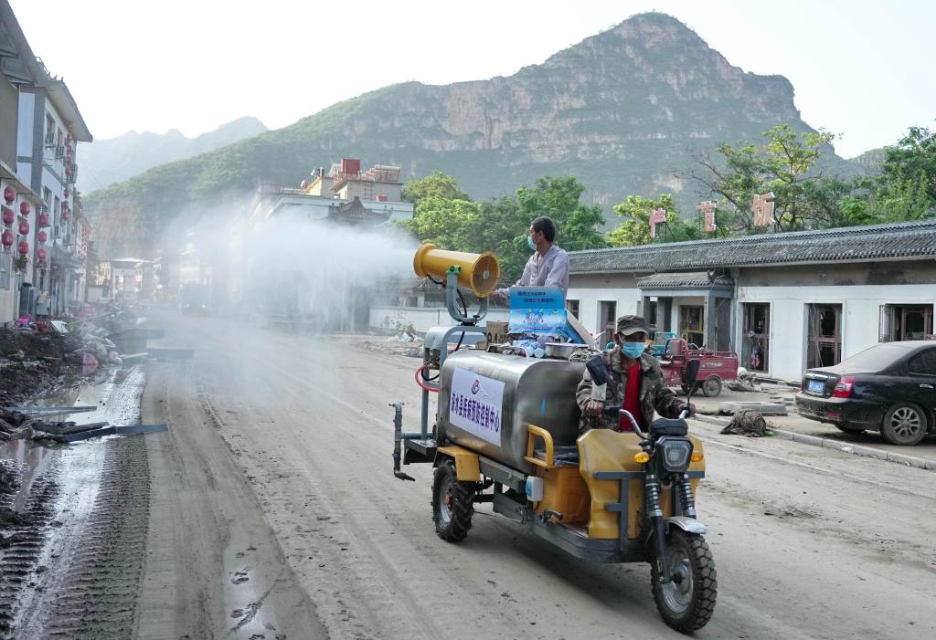 8月8日,在淶水縣三坡鎮下莊村,志愿者操作機械設備清理道路上的淤泥。新華社記者楊世堯 攝
