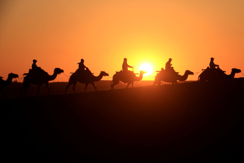 游客騎著(zhù)駱駝在敦煌鳴沙山月牙泉景區游覽(2023年6月7日攝)。新華社發(fā)(張曉亮攝)
