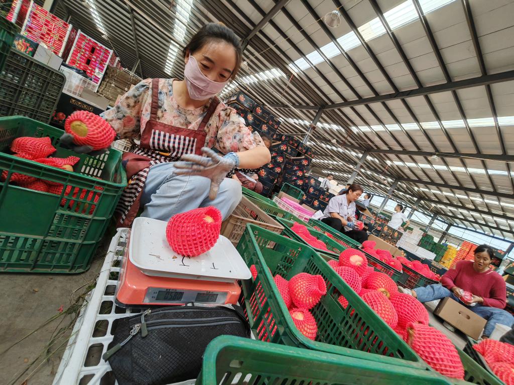 9月19日,會(huì )理市鹿廠(chǎng)鎮白草村農產(chǎn)品物流園區,務(wù)工人員正在分揀石榴果。新華社記者江毅 攝