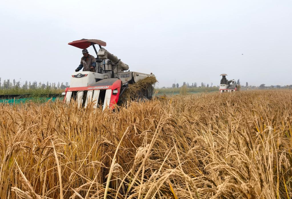 程風(fēng)偉所在的“稻客”車(chē)隊在收割水稻。新華社記者靳赫 攝