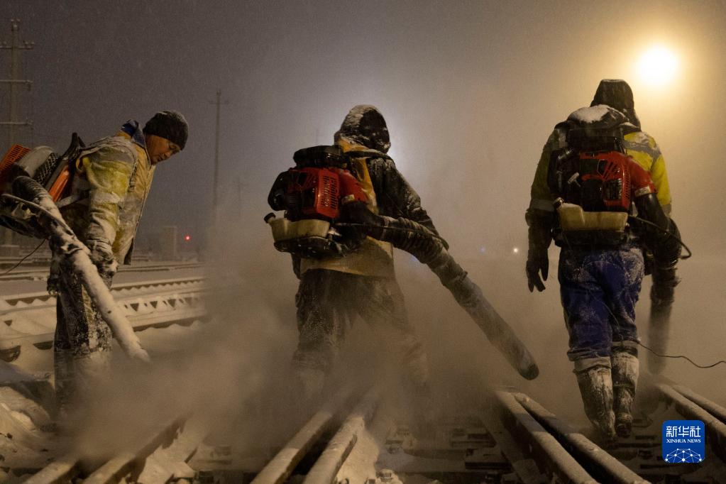 11月22日凌晨,在雞西站西場(chǎng),工作人員進(jìn)行清雪作業(yè)。
