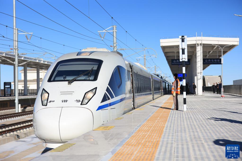 12月5日,動(dòng)車(chē)組列車(chē)??吭谔m新高鐵山丹馬場(chǎng)站。新華社發(fā)(王超 攝)