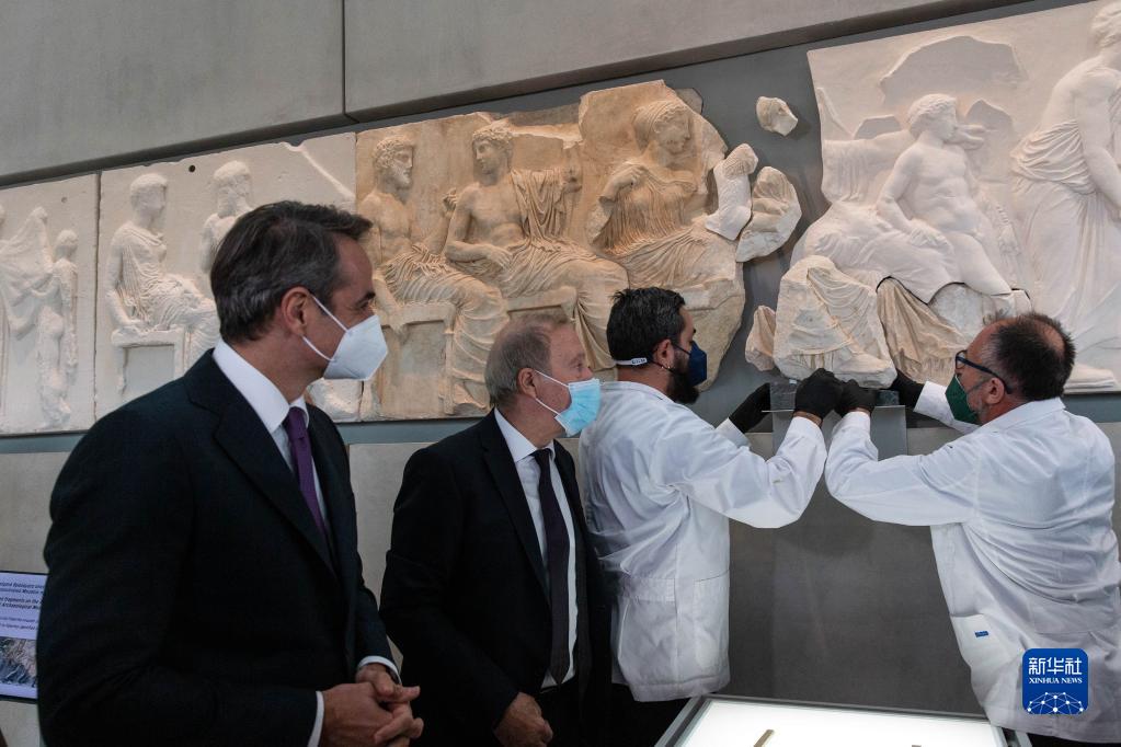 在意大利和希臘兩國博物館簽署長(cháng)期租借協(xié)議后,原保存在意大利一家博物館的一塊雅典衛城帕特農神廟石雕碎片10日在希臘雅典衛城博物館展出。
