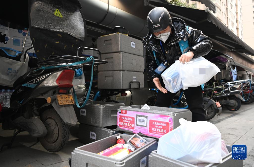 1月11日,西安市碑林區南稍門(mén)一家生鮮店的配送員準備配送。