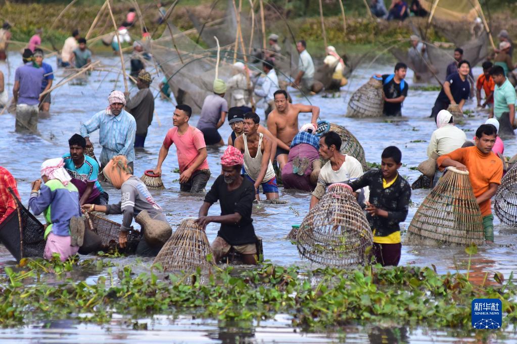 1月13日,在印度阿薩姆邦高哈蒂一處村莊,當地村民參加捕魚(yú)活動(dòng),慶祝收獲季的結束。新華社發(fā)