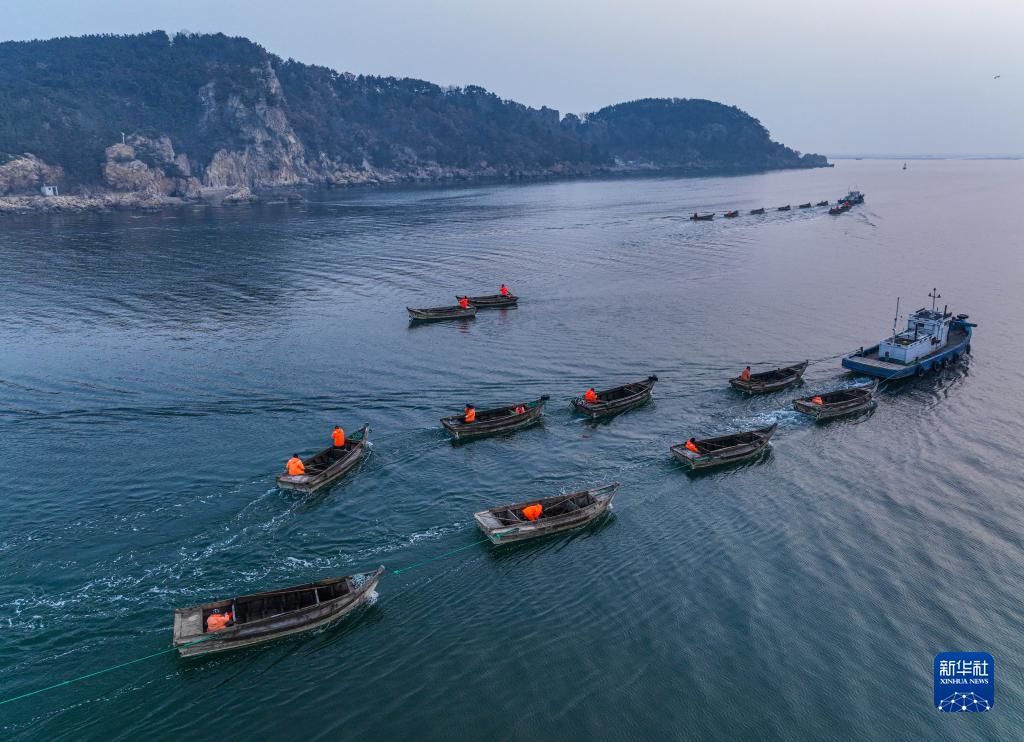 2月11日,在山東省榮成市俚島灣畔,漁民們駕駛著(zhù)各類(lèi)漁船舢舨前往養殖海區作業(yè)(無(wú)人機照片)。