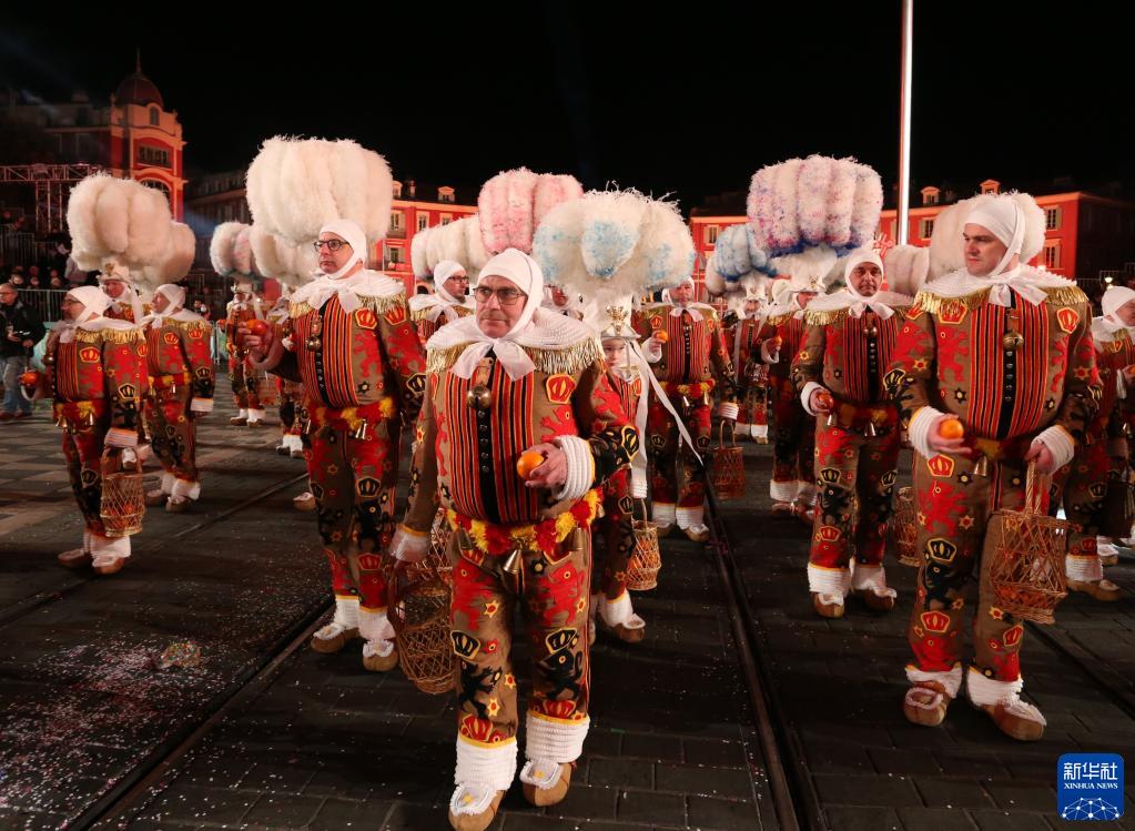 這是2月12日在法國南部城市尼斯拍攝的狂歡節花車(chē)夜間游行現場(chǎng)。