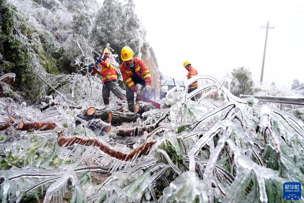 2月21日,在廣西金秀瑤族自治縣金秀鎮長(cháng)二村,公路管護人員加緊清理被冰雪壓斷在路面的樹(shù)枝。