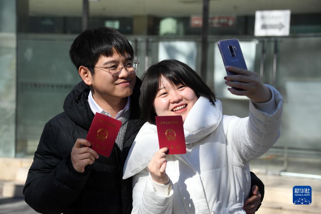 2月22日,在北京市海淀區民政局婚姻登記處外,一對新人領(lǐng)取結婚證后拍照留念。