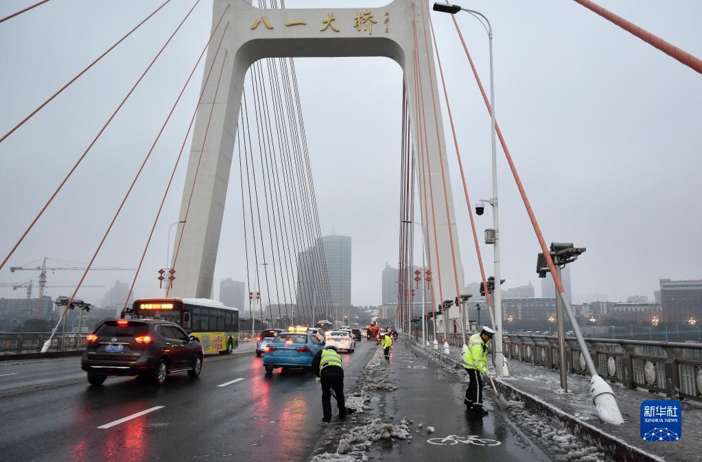 2月23日,江西省南昌市東湖區交警在八一大橋掃雪除冰。