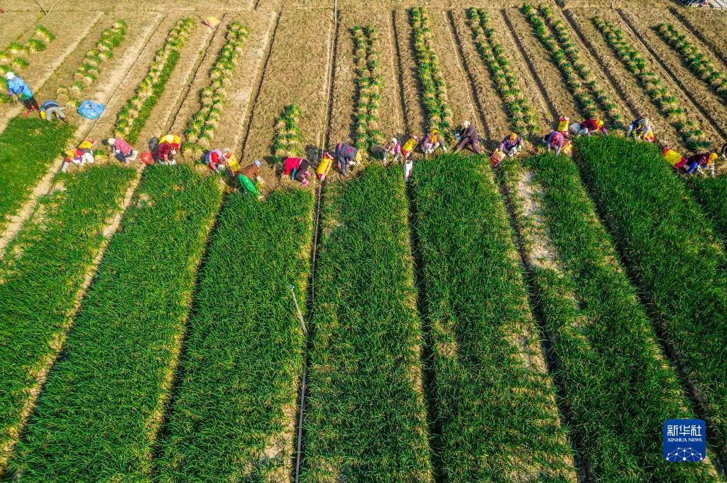 2月23日,江蘇省興化市垛田街道王橫村農民在收獲香蔥(無(wú)人機照片)。
