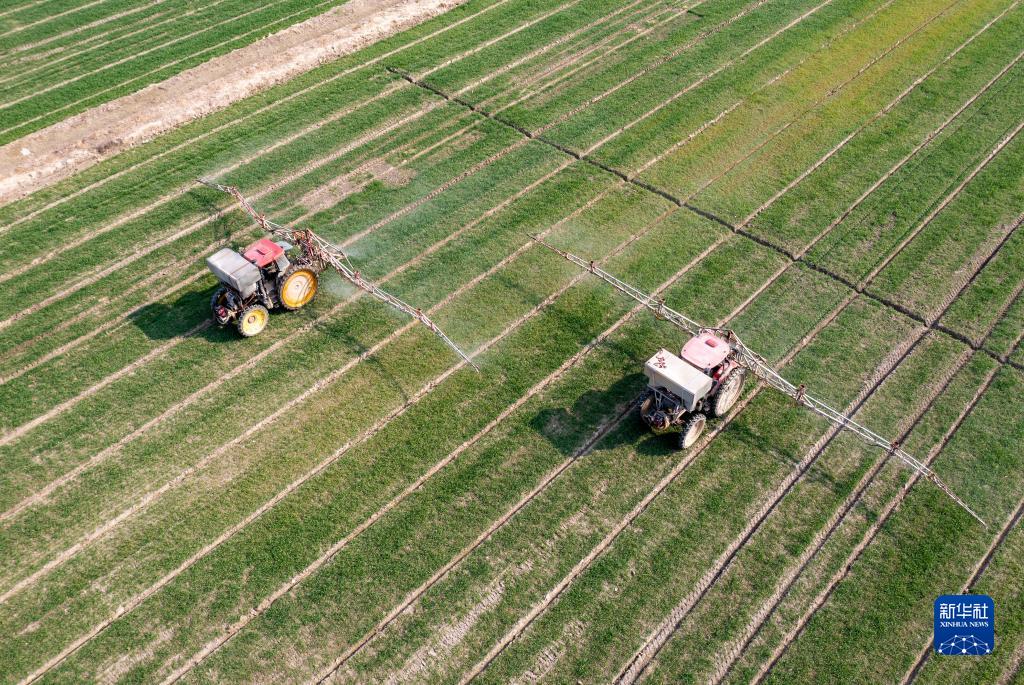 2月23日,在江蘇省海安市大公鎮王院村,村民駕駛農機為小麥噴施營(yíng)養液(無(wú)人機照片)。
