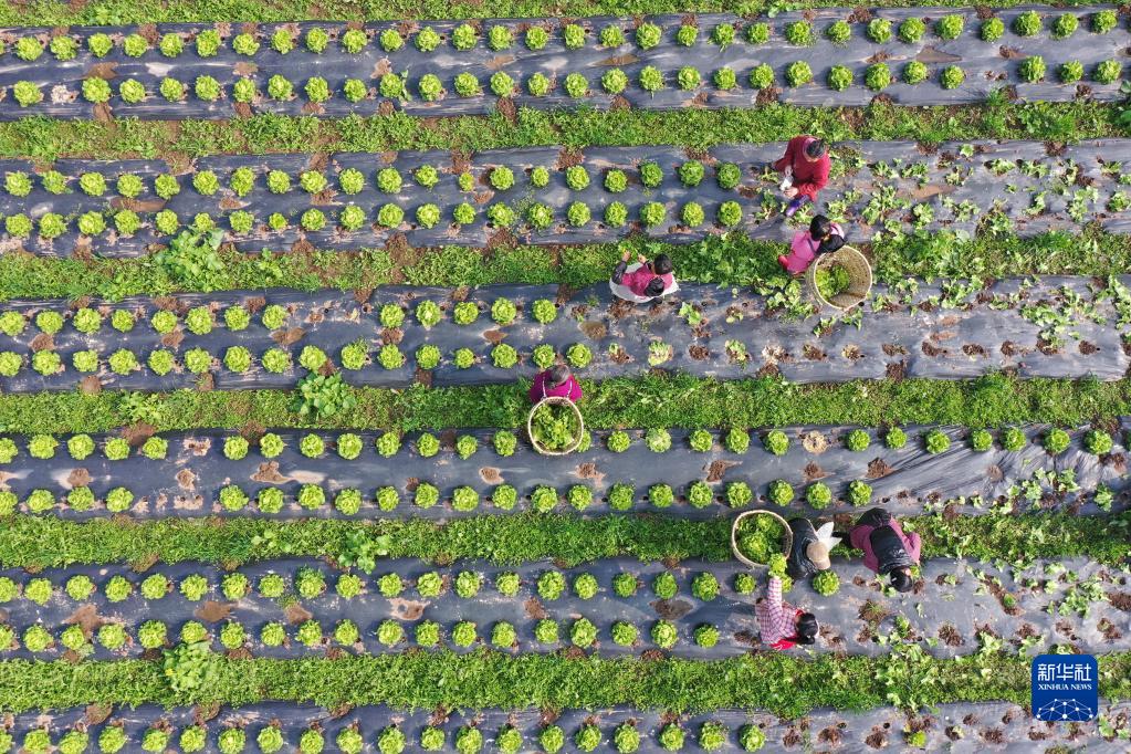 2月23日,在四川省眉山市中法農業(yè)科技園蔬菜種植基地,農民在采收蔬菜(無(wú)人機照片)。