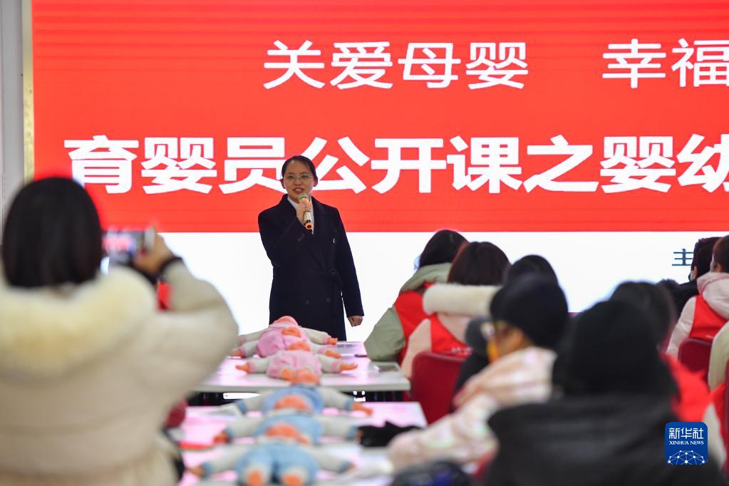 2月24日,在湘潭市雨湖區人力資源和社會(huì )保障服務(wù)中心,老師在育嬰員培訓班上為學(xué)員講解育嬰知識。