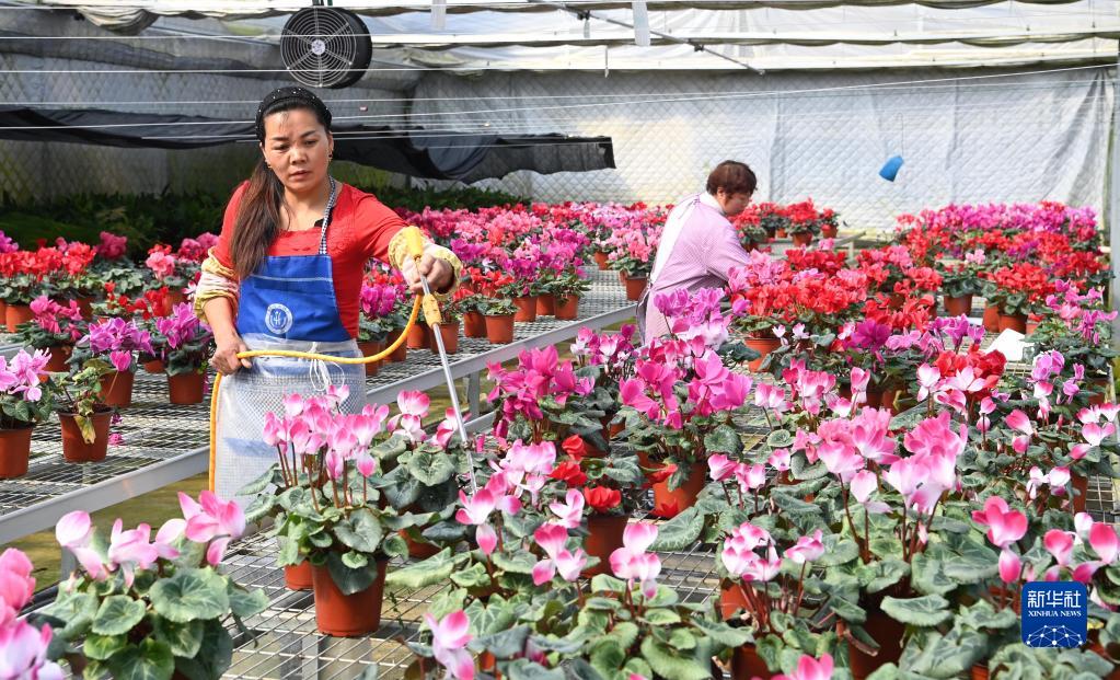 2月24日,留壩縣馬道鎮沙壩村高山花卉基地員工在為鮮花澆水。