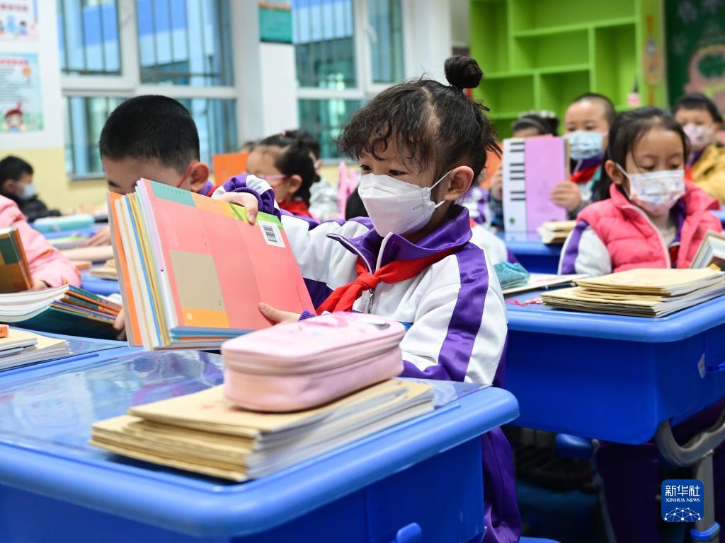3月1日,西寧市城西區文匯小學(xué)學(xué)生在整理新課本。