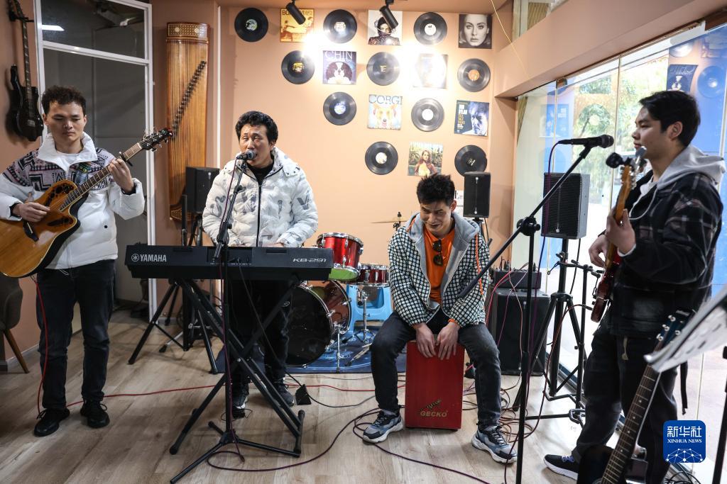 3月1日,“折耳根”樂(lè )隊在琴行內排練。從左到右依次是吉他手楊志、主唱陳克興、鼓手陳昌海、貝斯手彭萬(wàn)海。