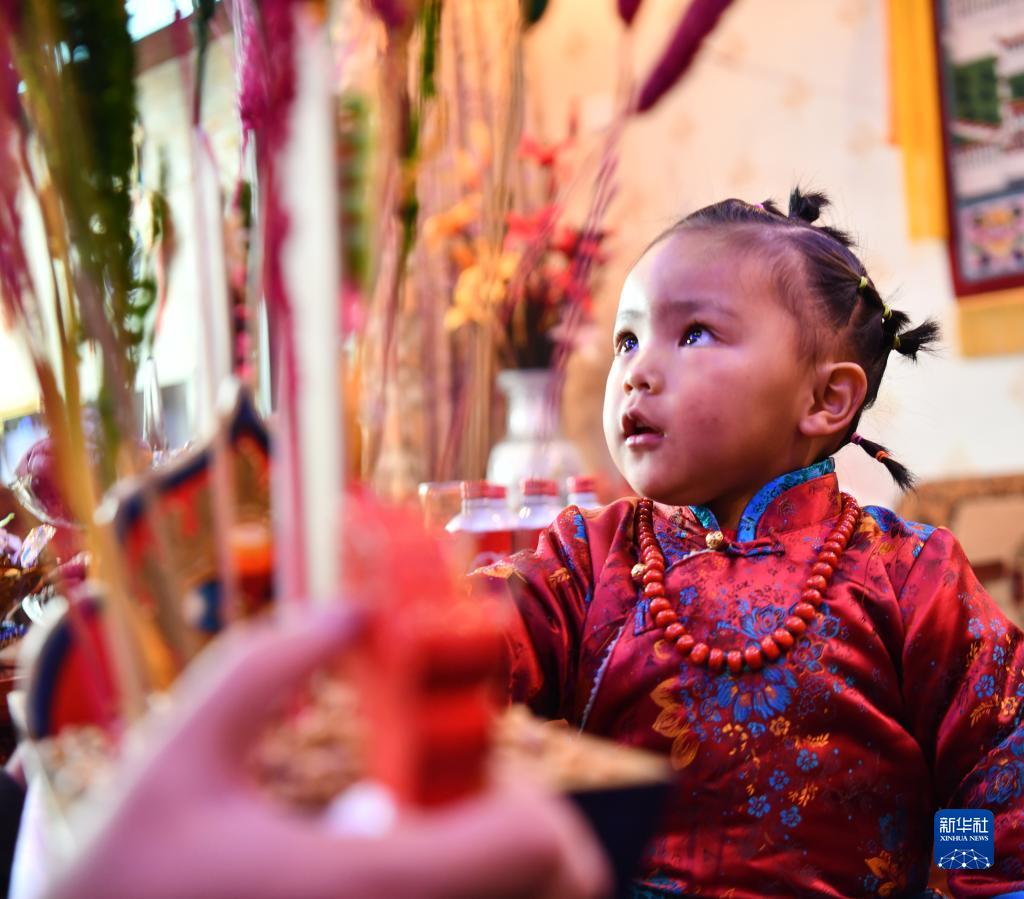 3月3日,在西藏拉薩,身著(zhù)藏裝的小姑娘在吃“切瑪”。