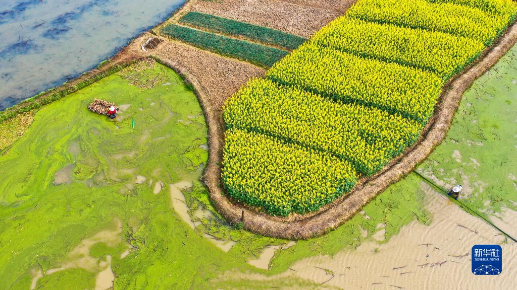 3月13日,在湖南省衡陽(yáng)市常寧市板橋鎮板橋村,藕農在采收蓮藕(無(wú)人機照片)。