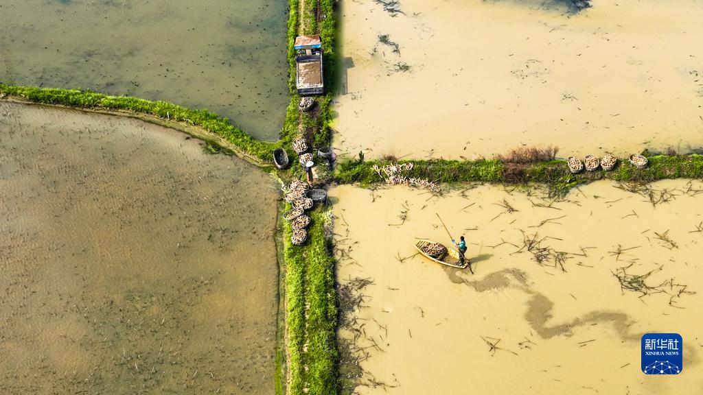 3月13日,在湖南省衡陽(yáng)市常寧市板橋鎮板橋村,藕農在藕田里轉運剛采收的蓮藕(無(wú)人機照片)。