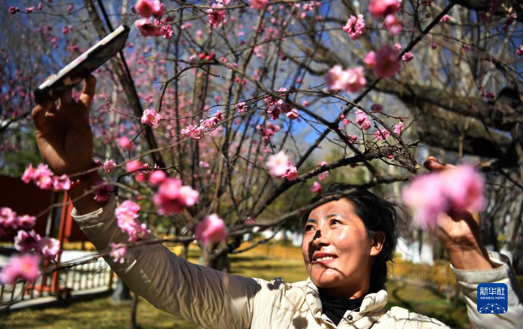 3月20日,一名女子在拉薩市龍王潭公園內的春花前自拍留影。