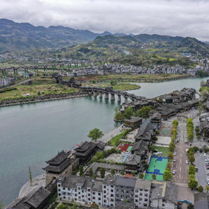 這是3月22日拍攝的重慶市黔江區濯水古鎮景區內的風(fēng)雨廊橋(無(wú)人機照片)。