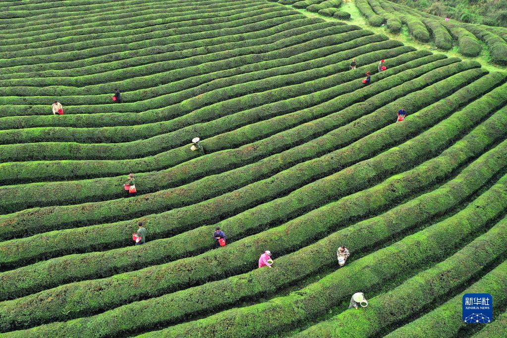 3月24日,在江西省宜春市上高縣新界埠鎮一茶場(chǎng),村民采摘明前茶。