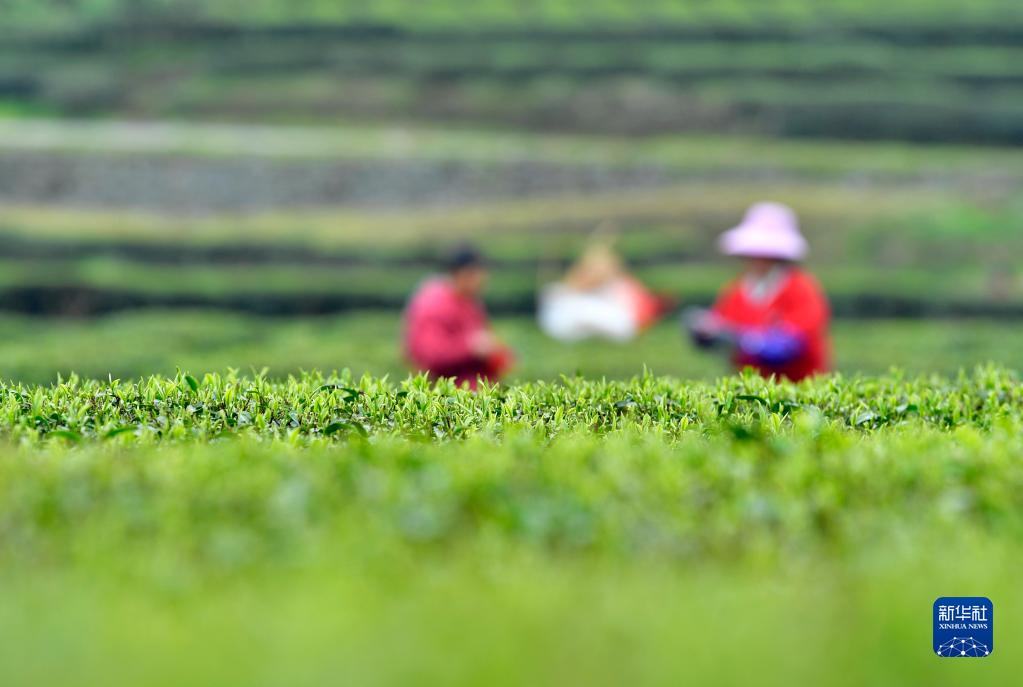 3月24日,茶農在湖北省宣恩縣椒園鎮慶陽(yáng)壩村的茶園里采摘明前茶。