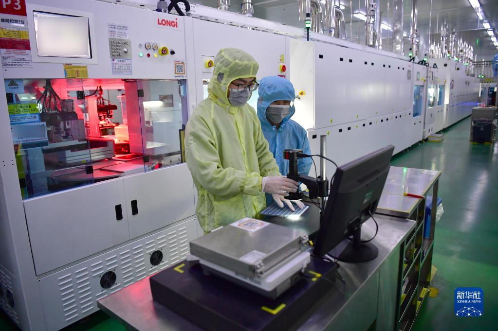 3月25日,工作人員在隆基單晶硅太陽(yáng)能電池工廠(chǎng)內檢查電池片。