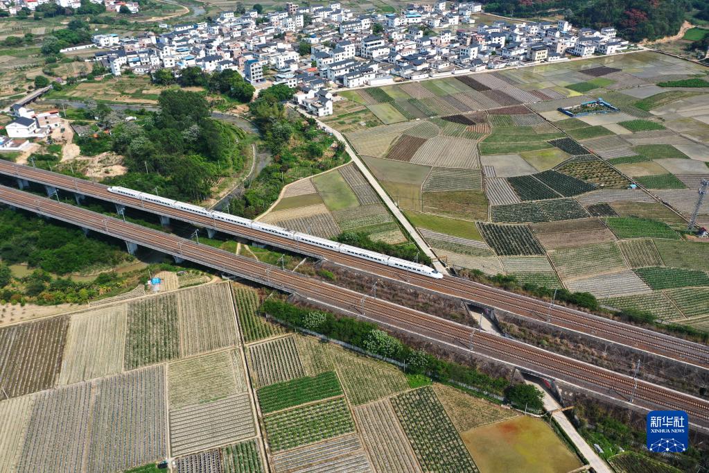 4月6日,一列火車(chē)駛過(guò)廣西南寧市興寧區五塘鎮的田園(無(wú)人機照片)。