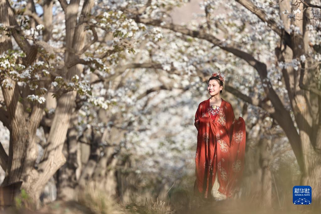 4月7日,景區工作人員在百年梨園內進(jìn)行表演。