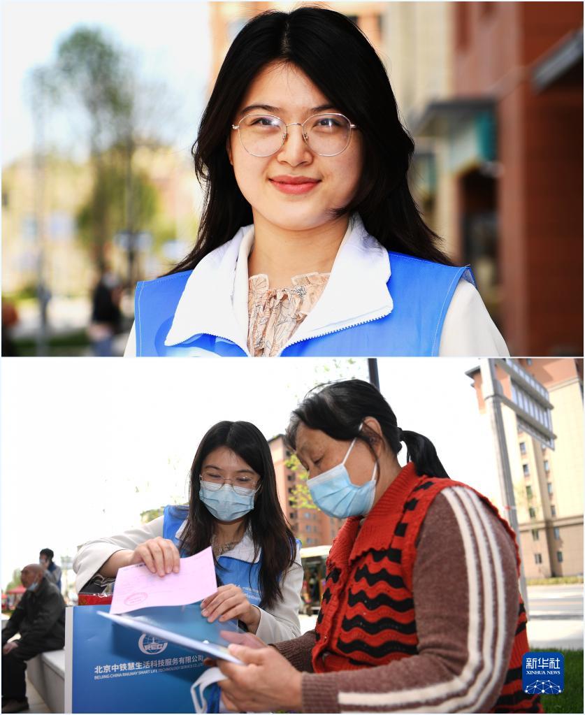 拼版照片:上圖為中國雄安集團城市發(fā)展公司張曉蕊(4月22日攝);下圖為張曉蕊在雄安容東片區安置房交付現場(chǎng)幫助群眾整理資料(4月22日攝)。