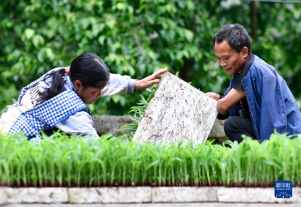 趙友良與妻子簡(jiǎn)琴清理準備移栽的玉米苗(5月12日攝)。