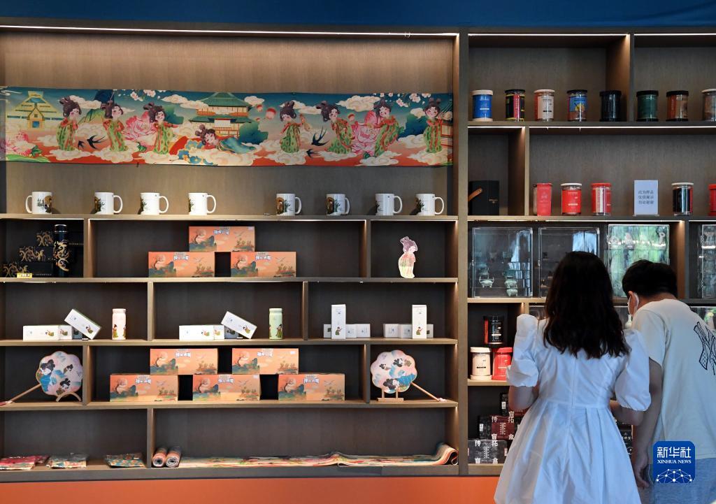 5月17日,兩位參觀(guān)者在河南博物院文創(chuàng )商店內挑選文創(chuàng )產(chǎn)品。