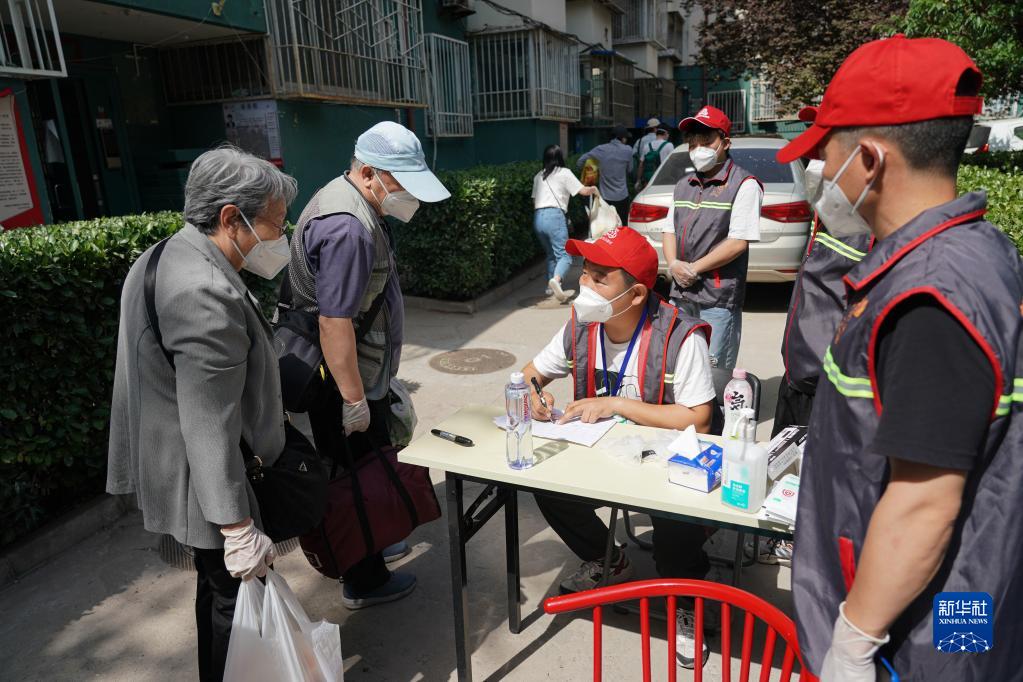 5月28日,工作人員在南新園小區內為返回居民登記信息。
