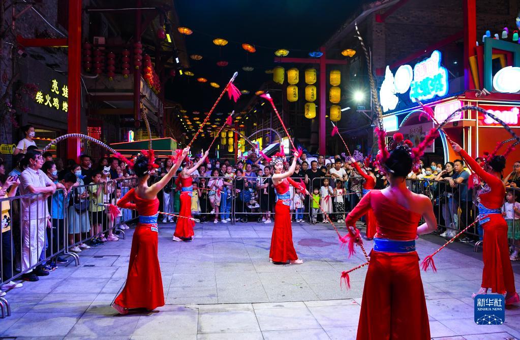 游客在重慶陶然居大觀(guān)園新國潮坊觀(guān)看文藝表演(6月1日攝)。