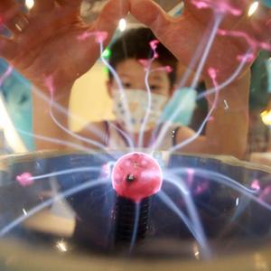 7月17日,小朋友在江蘇揚州科技館內體驗“輝光球”。