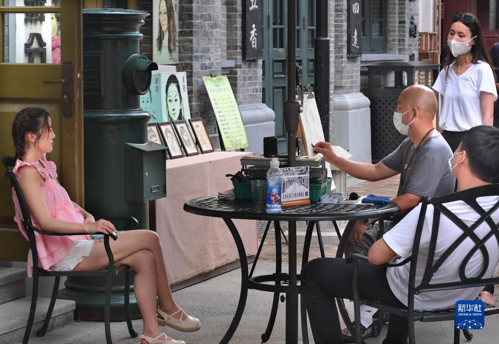 7月18日,畫(huà)師在電影小鎮里為游客畫(huà)素描肖像。