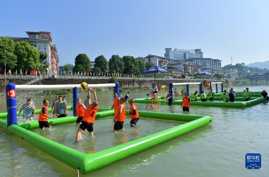 近日,湖北省宣恩縣在當地仙山貢水旅游區的貢水河上舉行水上運動(dòng)會(huì )。別具一格的“水上排球”項目吸引了眾多市民和游客參加比賽,享受水上趣味運動(dòng)帶來(lái)的歡樂(lè )。
