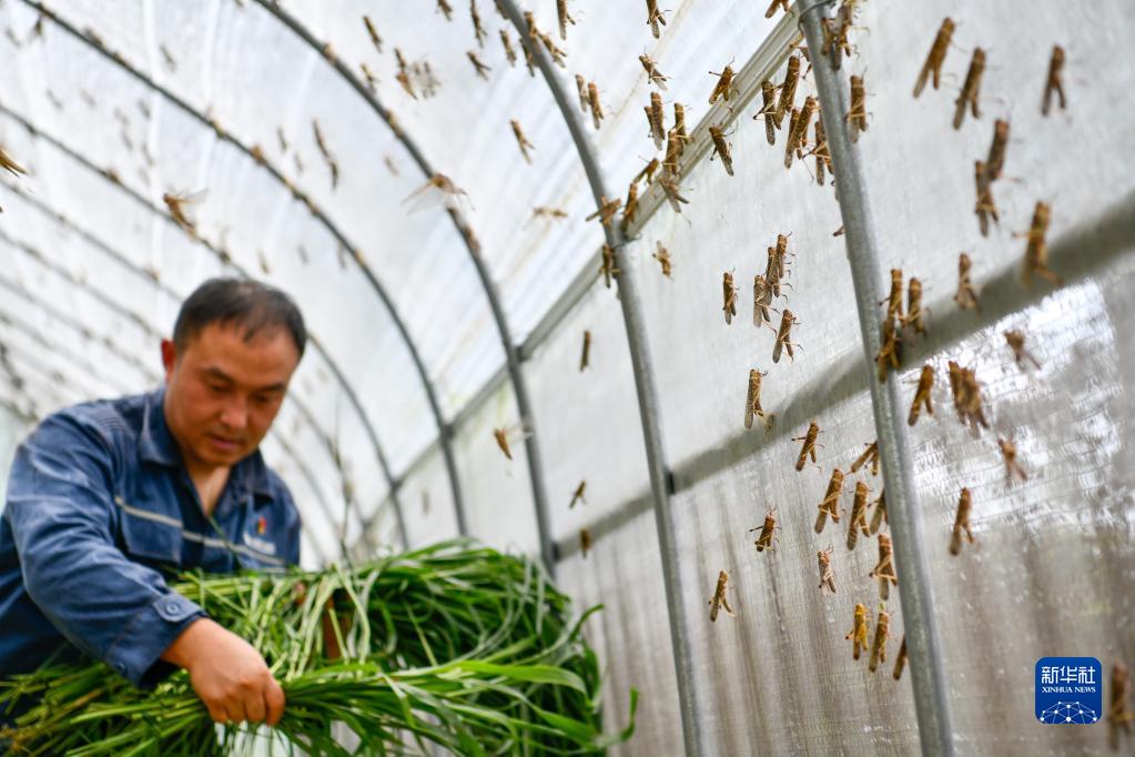 8月3日,在貴州省臺江縣臺盤(pán)鄉棉花村,駐村干部在給螞蚱投放草料。